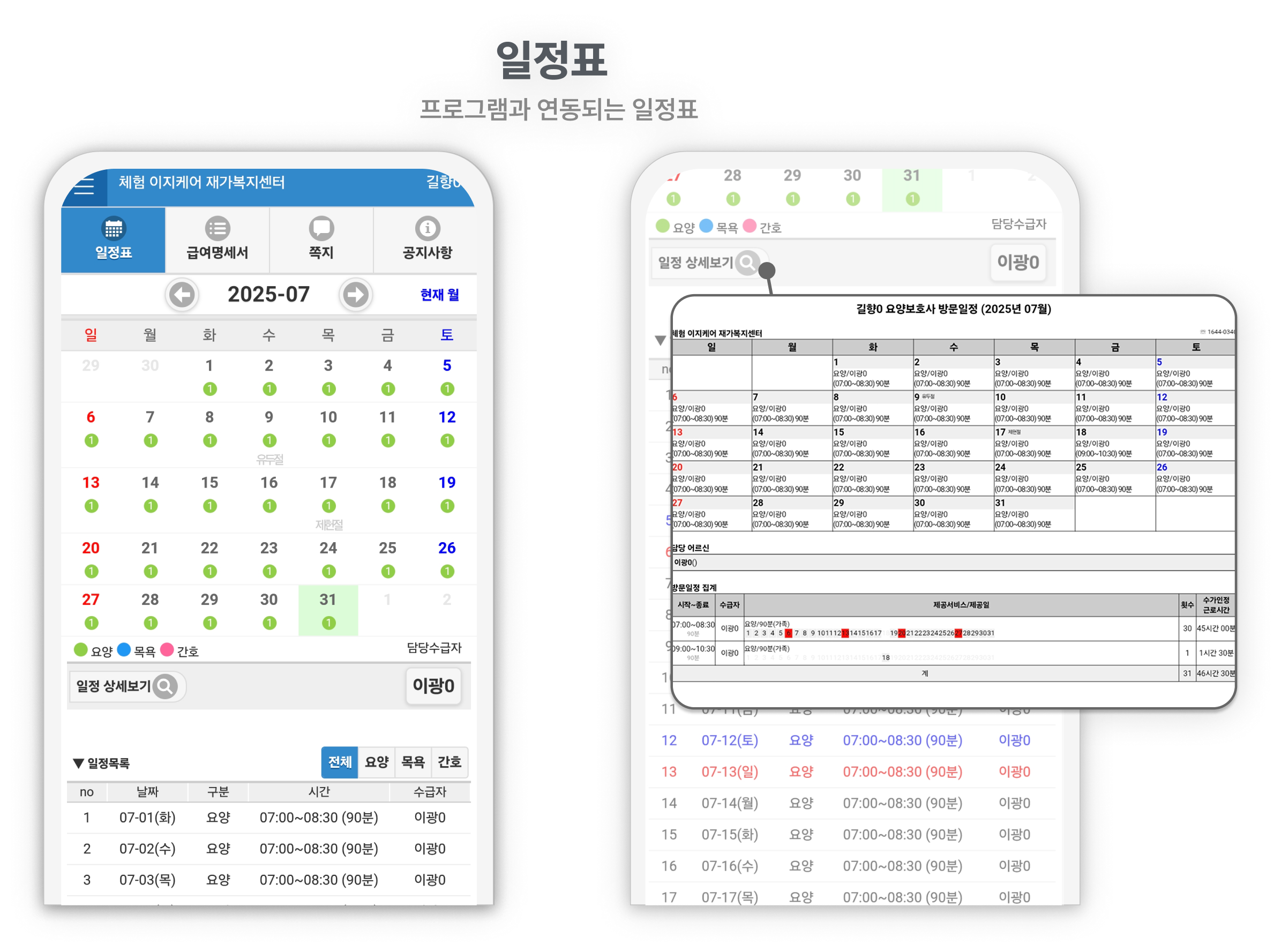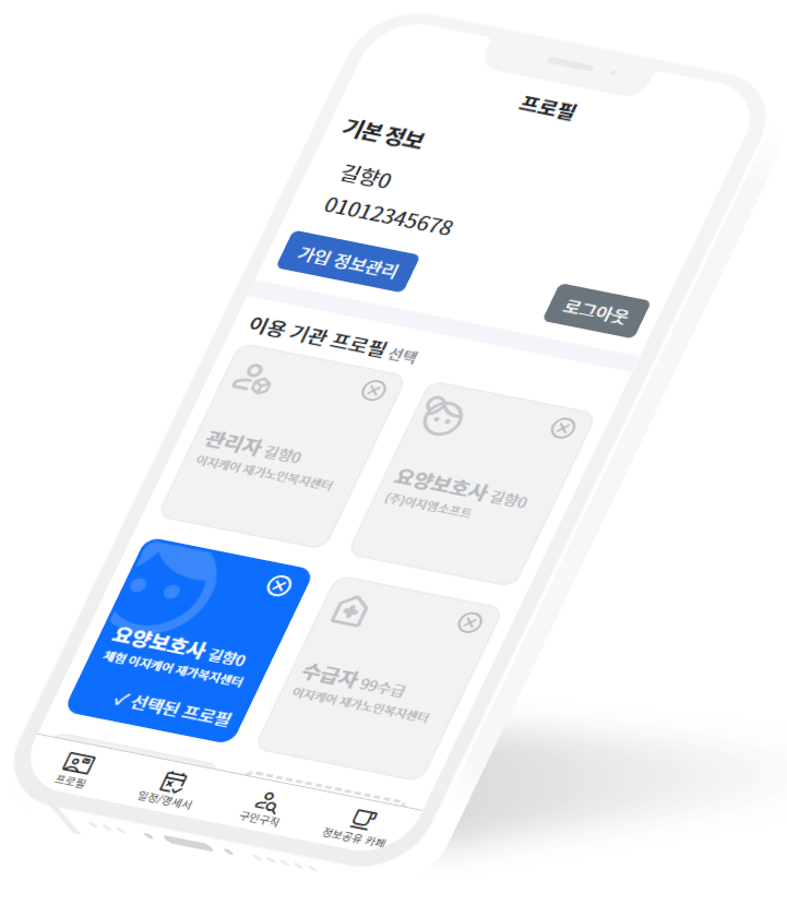 간단한 기관 업무 처리는 물론, 수급자 및 요양보호사의 일정, 명세서, 청구서 등을 모바일로 간편하게 확인할 수 있습니다.